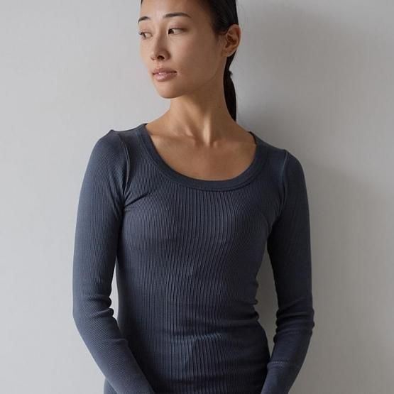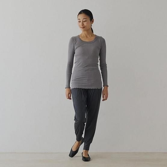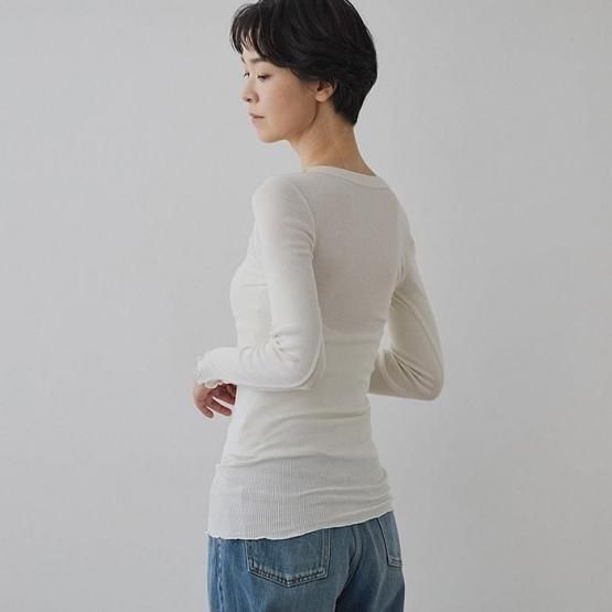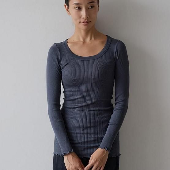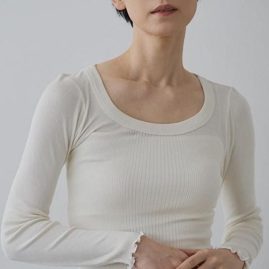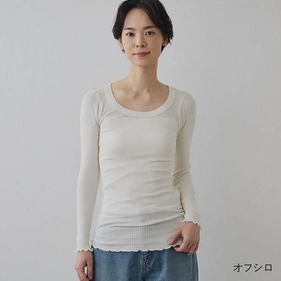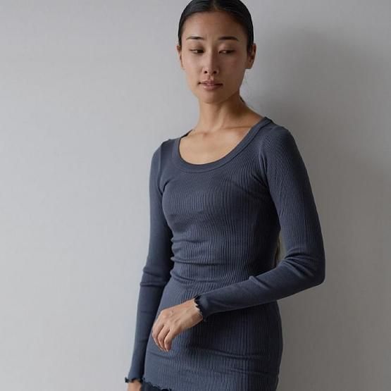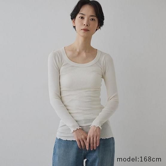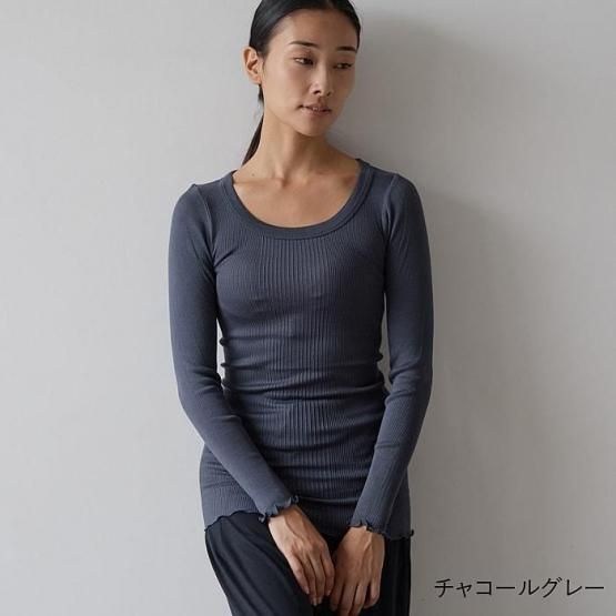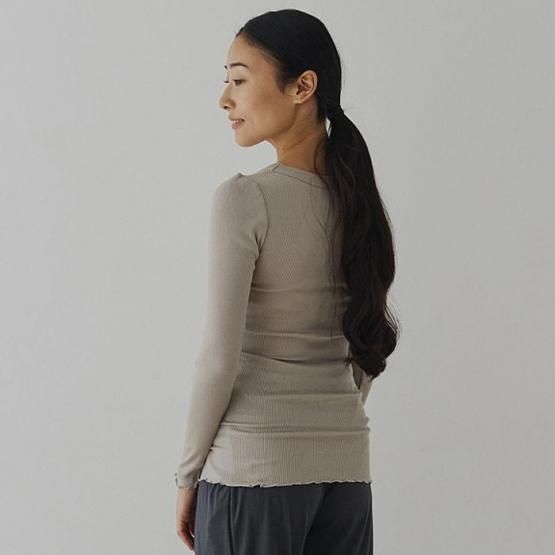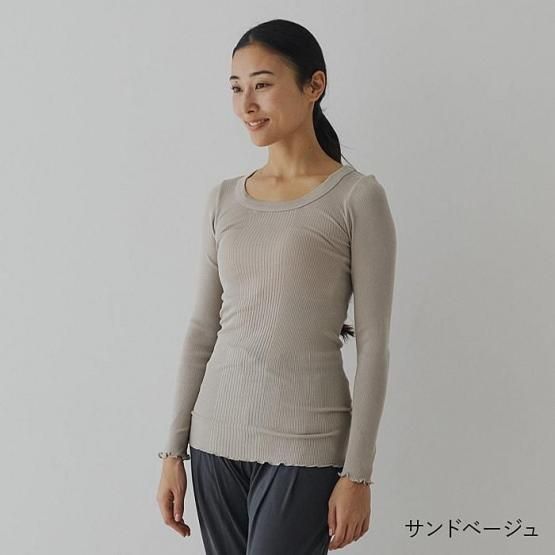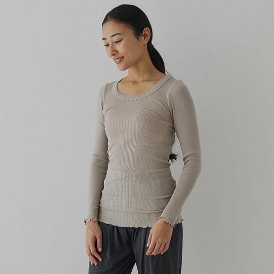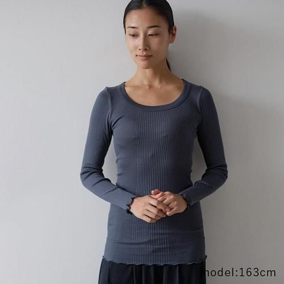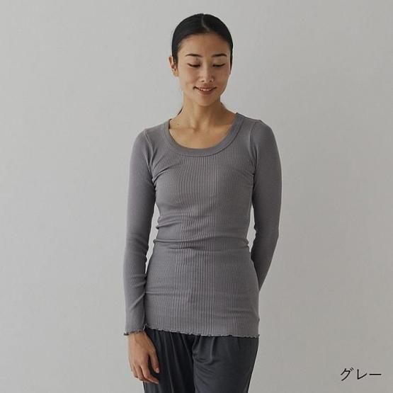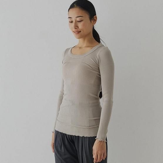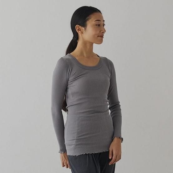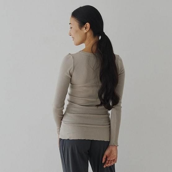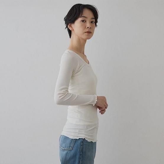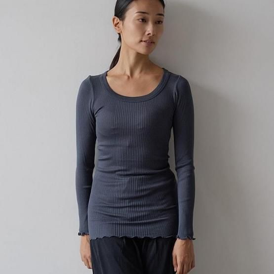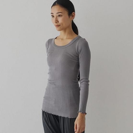 シルク100%のリブ編みの長袖カットソーです。インナー使用が中心ですが、シンプルでTシャツ感覚で着られるものを目指しました。