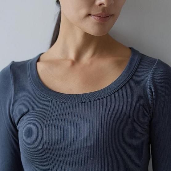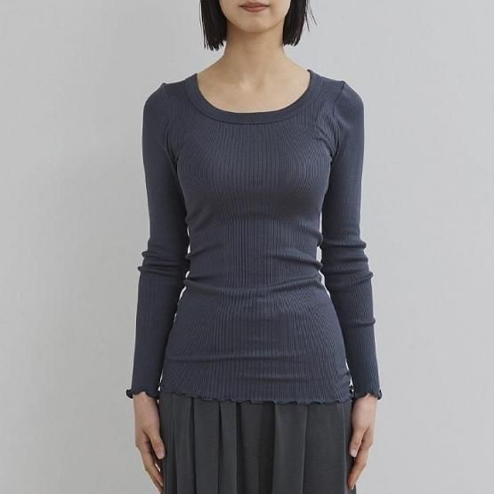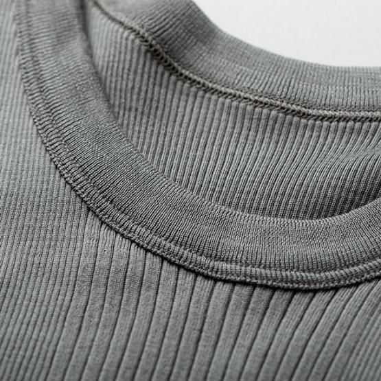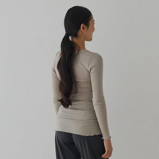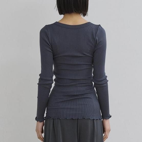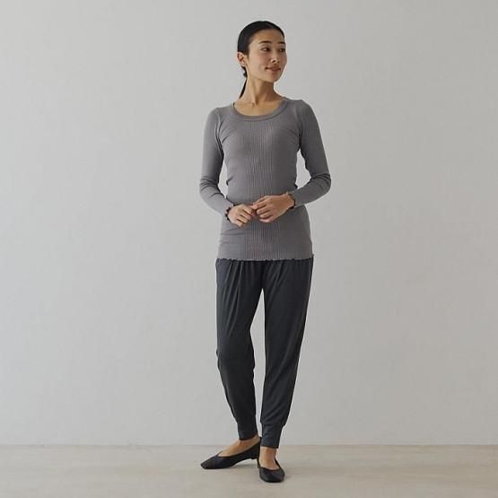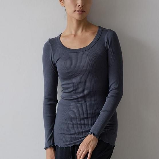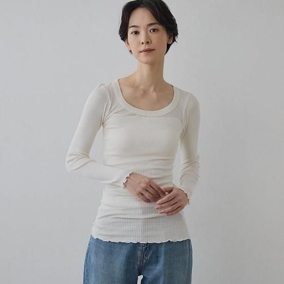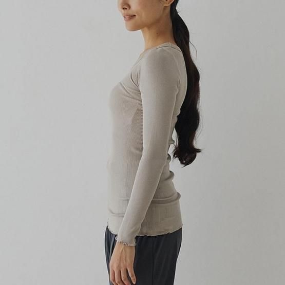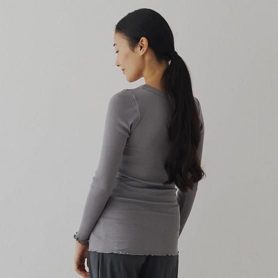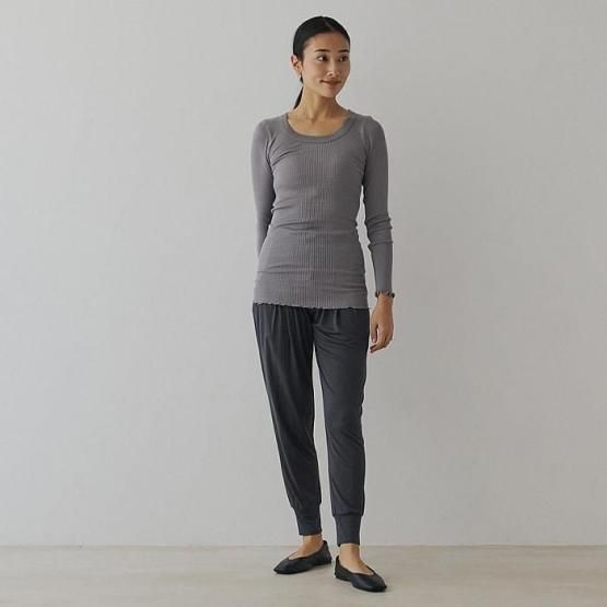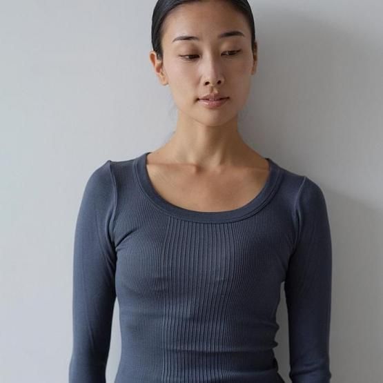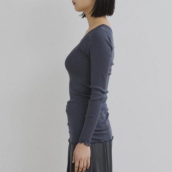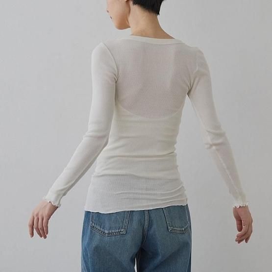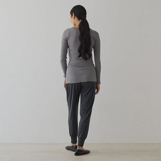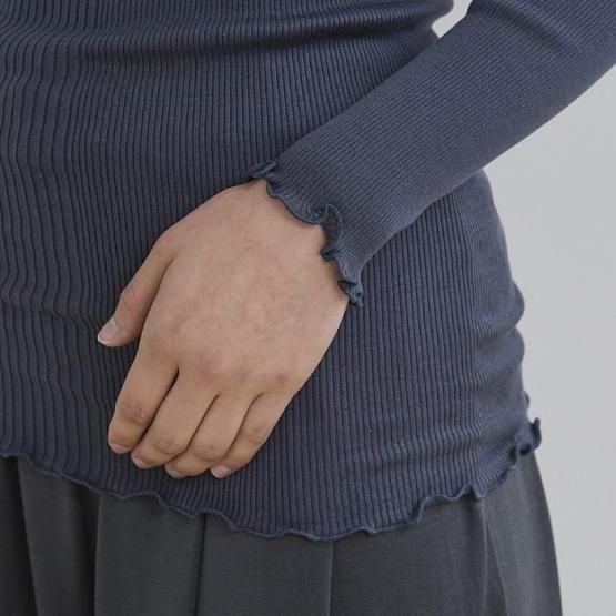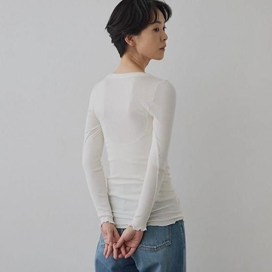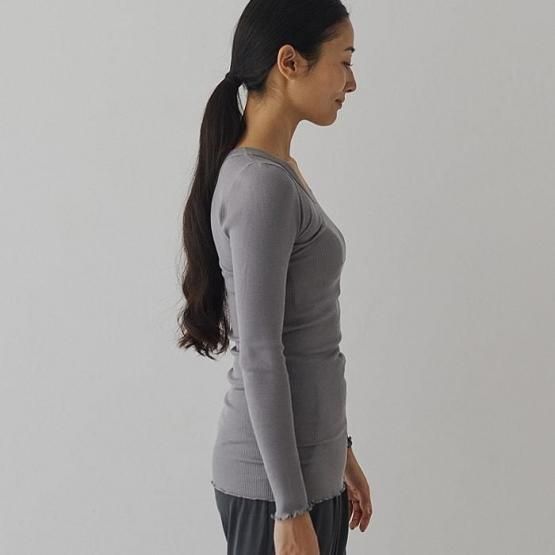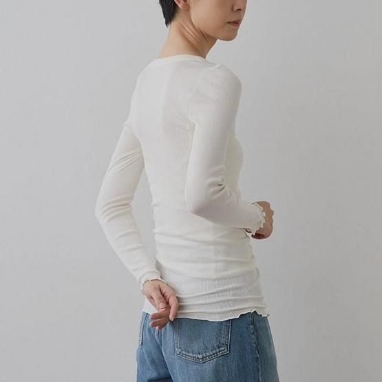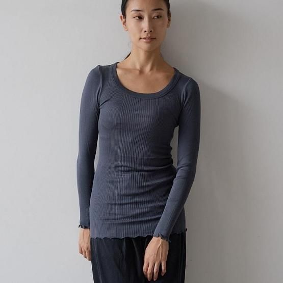 シルク100%のリブ編みの長袖カットソーです。インナー使用が中心ですが、シンプルでTシャツ感覚で着られるものを目指しました。