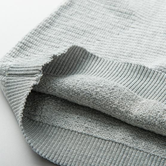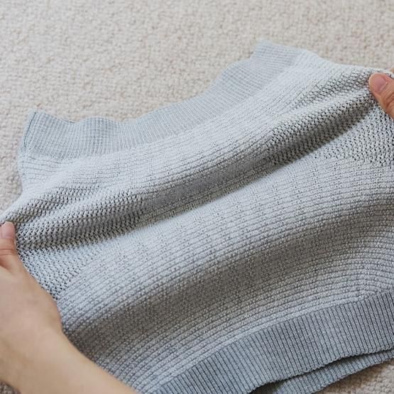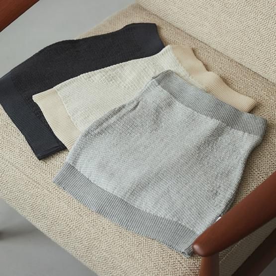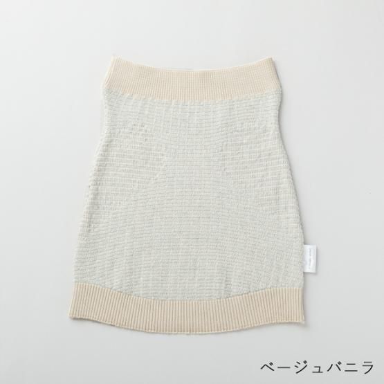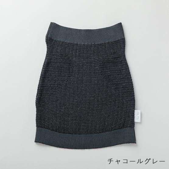 表側は綿でふくらみを持たせたふんわりとした編地、肌にあたる内側は保温性の高いシルクで、肌触りもしっとりと仕上げています。めくれ上がりを防ぐために前裾はゆるやかなカーブになっています。