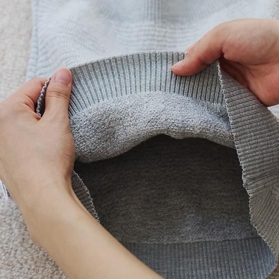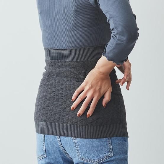 くびれに合わせた成形編みで、ウエスト部分から腰にかけてフィットします。着用中にズレたり、めくれたりして肝心な温め効果に問題があった従来の寸胴型から設計を大きく改善させました。洗濯ネームは、肌あたりを良くするために、あえて外側に付けてあります。