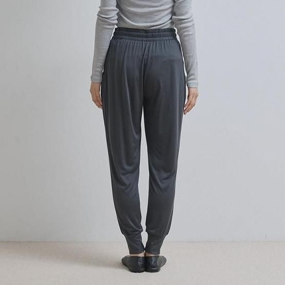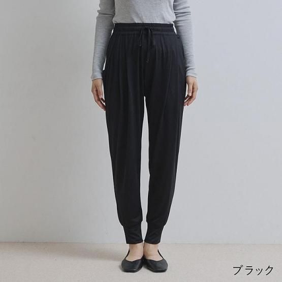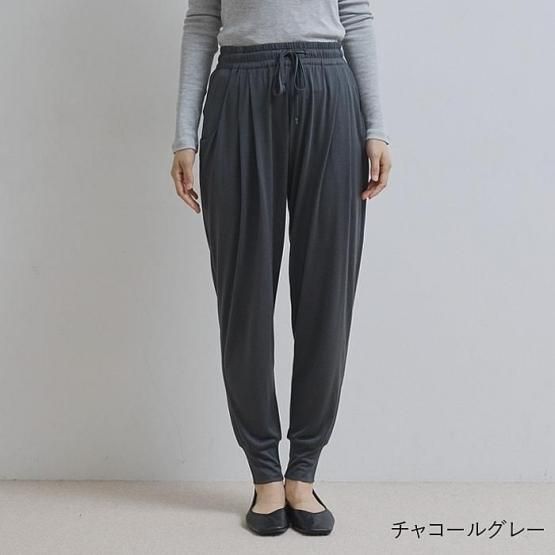 シルクとレーヨン(モダール)をミックスした素材が持つしなやかな落ち感とひかえめな光沢感、たっぷりとしたドレープがエレガントな雰囲気のパンツです。ストレッチが効いた柔らかい風合いはストレスフリーで驚くほど軽いはき心地。