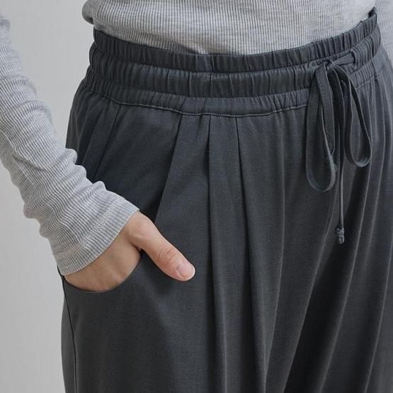 苦しくないように、ウエストは太幅ゴムと紐入りで調節可能。お腹を締め付けずストレスフリーではいていただけます。ややサイドに垂れる大きめポケットのデザインは腰まわりをカバーする役目も。ゆったりとしていながらもモードな雰囲気を出すためにこだわったポイントです。