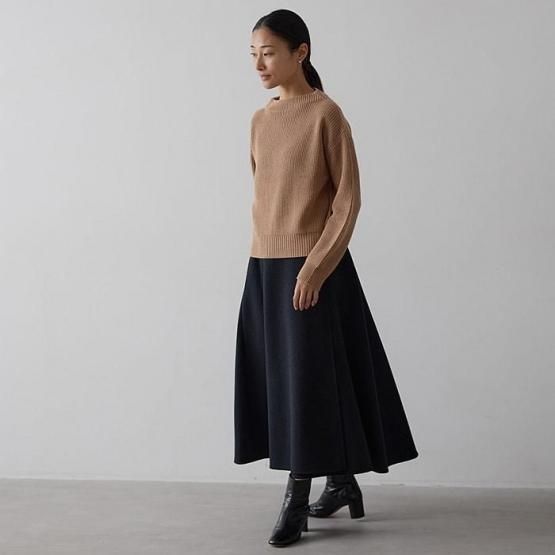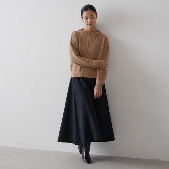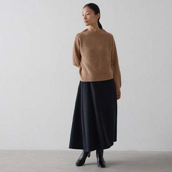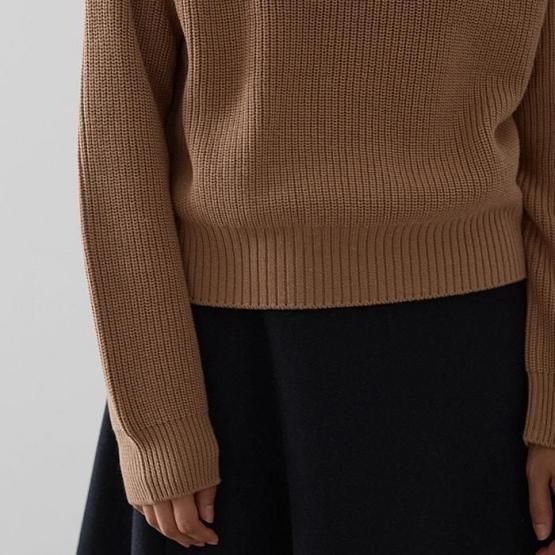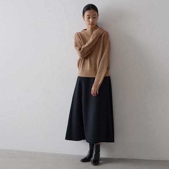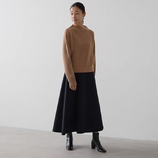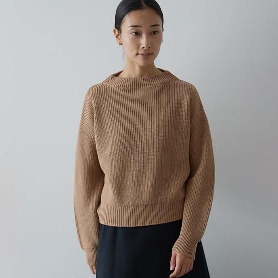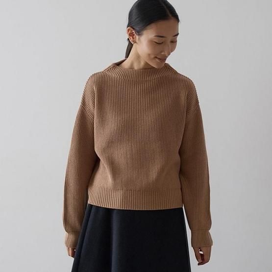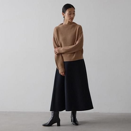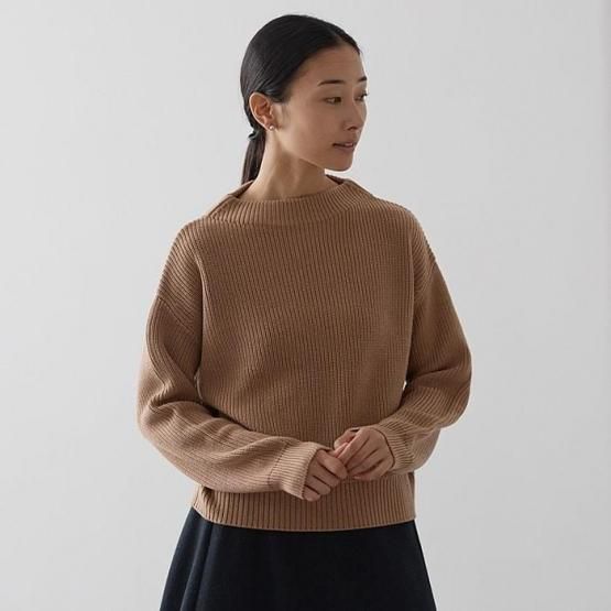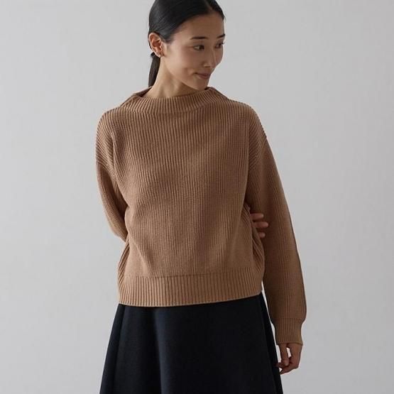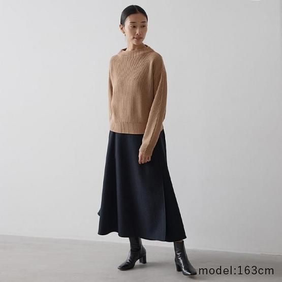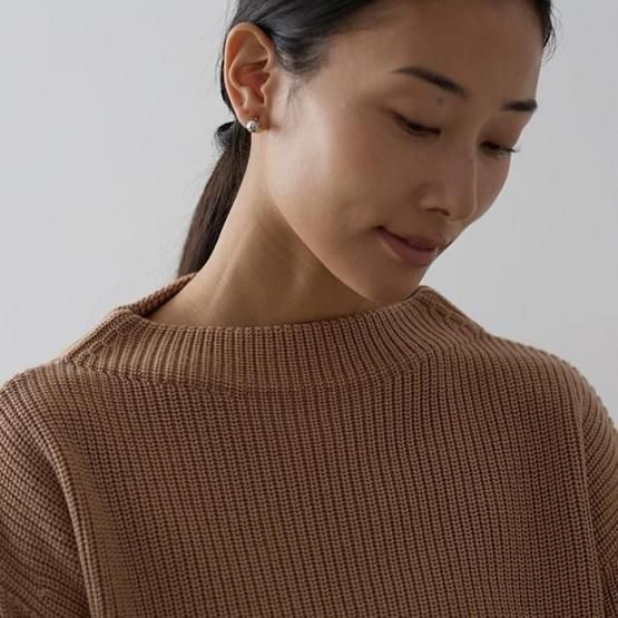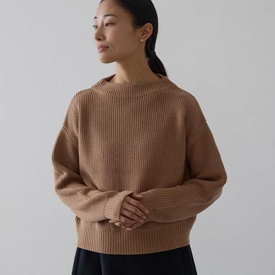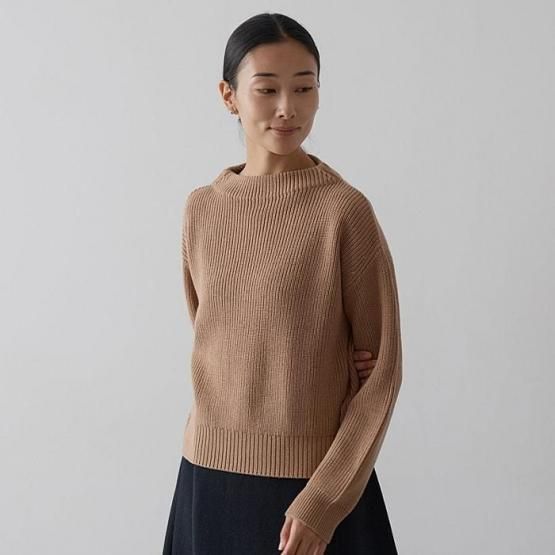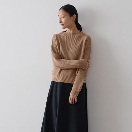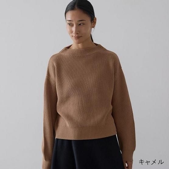 着丈はコンパクトですが、その分、身幅と袖はゆとりを持たせました。だから着ているだけで気分が上がる、ほどよく丸みのあるシルエット。シャツやカットソーを中に重ねても窮屈にならず、動きやすいのも助かります。 少し立ち上がったボトルネックは、顔まわりをすっきりと見せつつ、寒い日も首元を優しくふんわり包んでくれます。