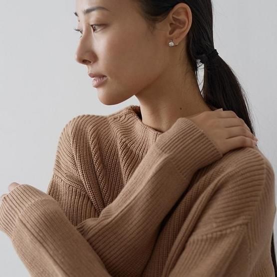 一枚で着るなら、ネックレスやスカーフなどで艶感を添えるのも素敵です。シャツを重ねて襟をのぞかせれば、きれいめにもカジュアルにも対応。シンプルでも着こなしの幅が広がる、頼れるベーシックニットです。