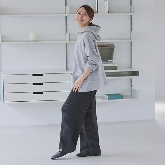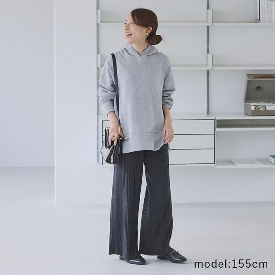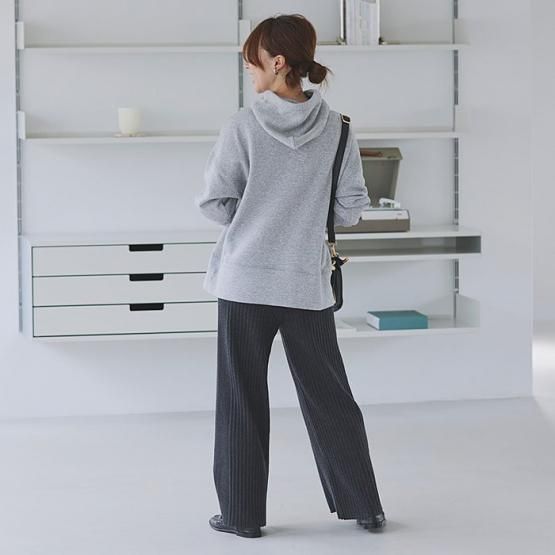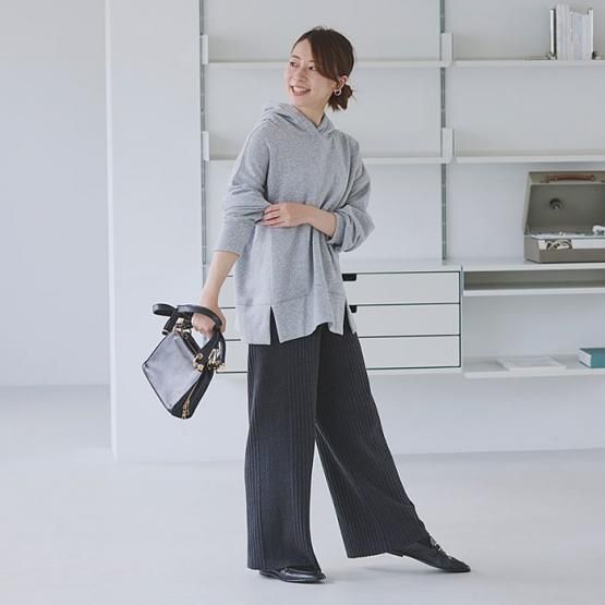 素材に特別感があるので、しっかりコーディネートすれば外出着としても遜色ない着こなしに。セットアップの上にコートを合わせるとラクなのに程よくきちんと感ある雰囲気に仕上がります。どんな場面でも着心地はラクなのにおしゃれに見えるパーカーは一押しトップスです。