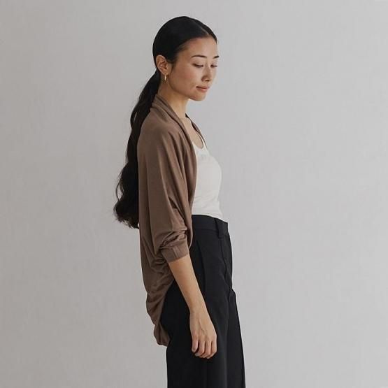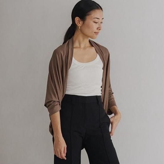 ボレロとカーディガンの良いトコ取りをしたユーズフルな羽織は、ドルマンスリーブと包み込むような円形のデザインが印象的。普通のカーディガンでは物足りないという時に、少しだけデザイン性があるものをプラスすると、大人のデイリースタイルをセンスよく格上げしてくれます。