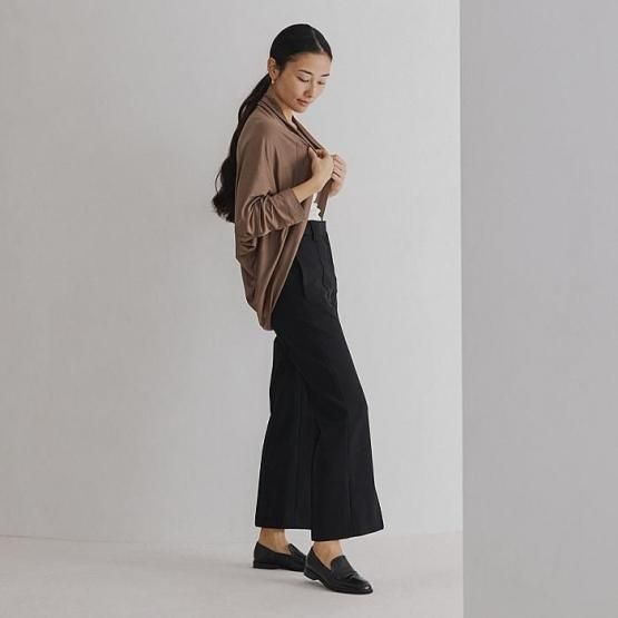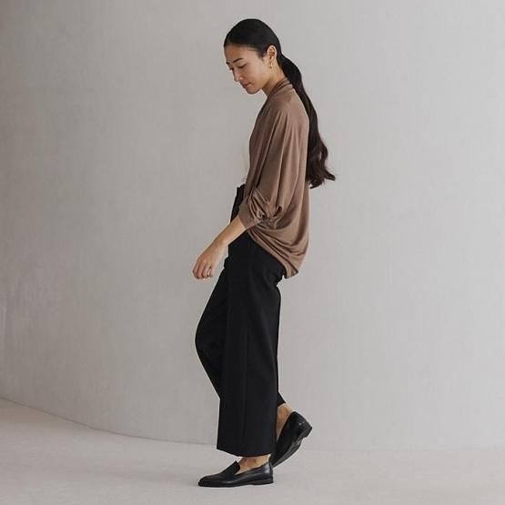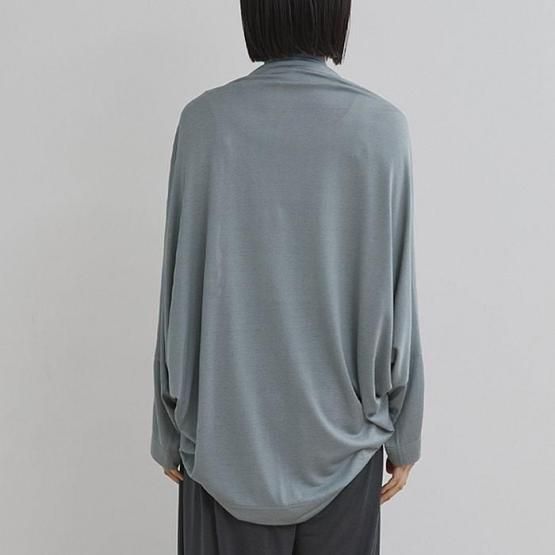 横から見た時に、裾に向かって流れるドレープがとても優雅でエレガント。 袖は長さがあるので、伸ばせば手首まで覆ってしっかりあたためてくれます。スタイリングする際、2〜3回ほど袖をまくるとこなれ感が増して、バランスよく着られます。