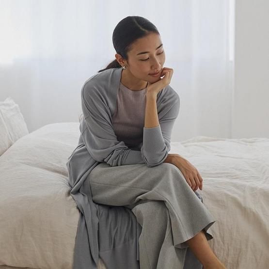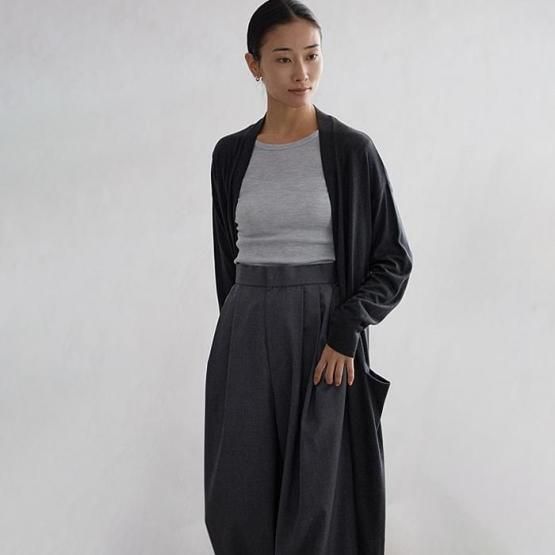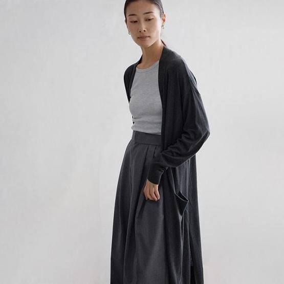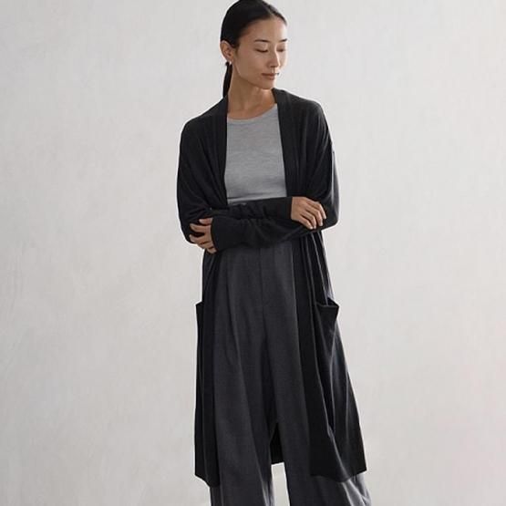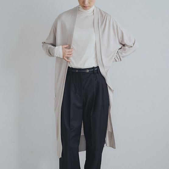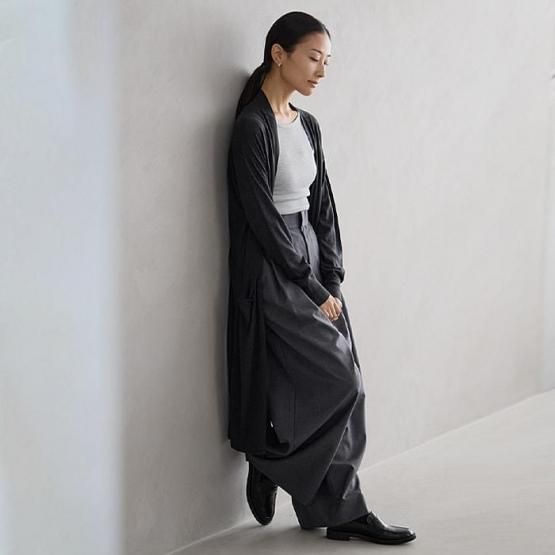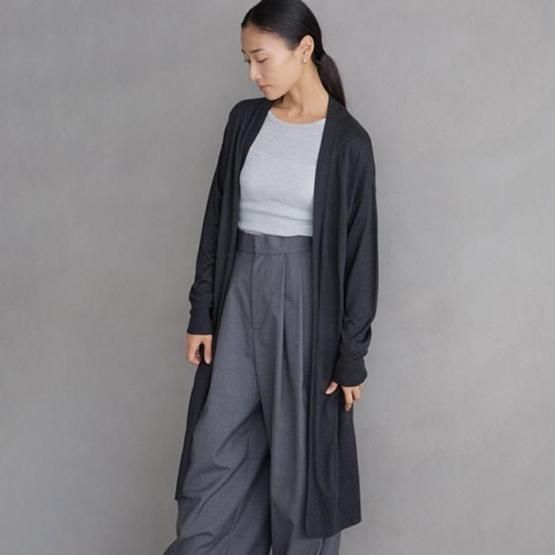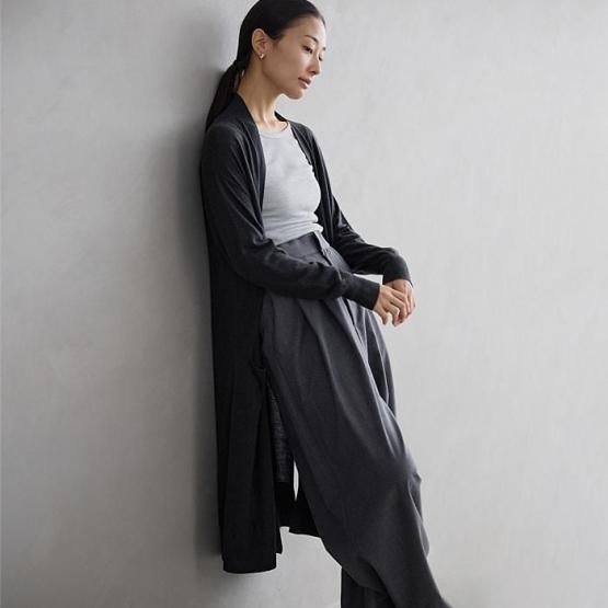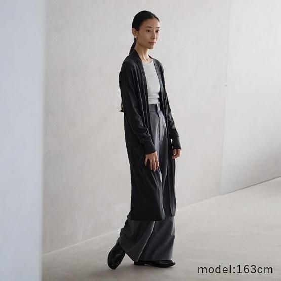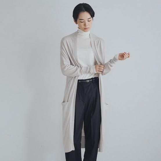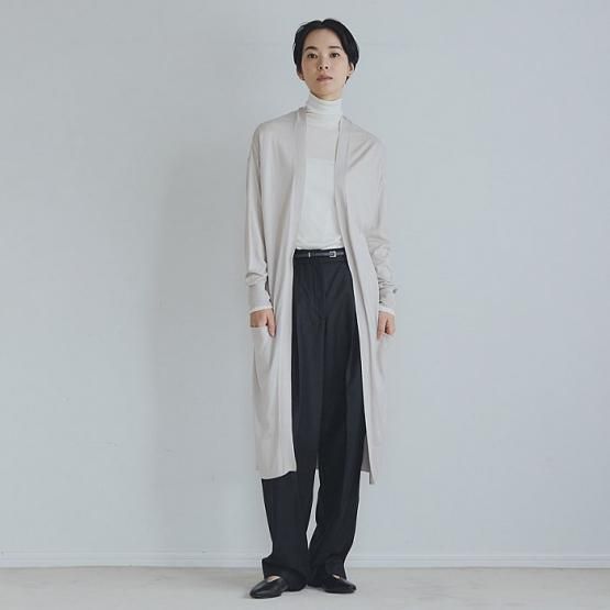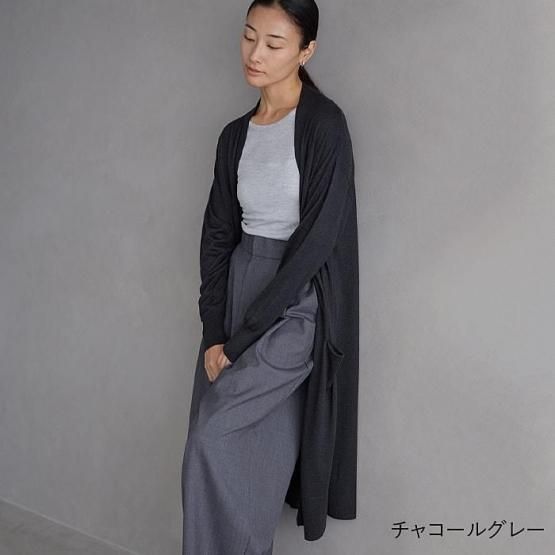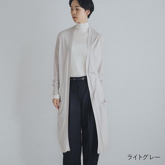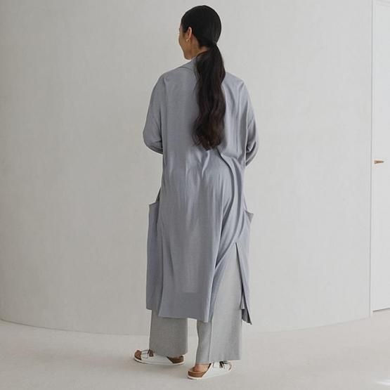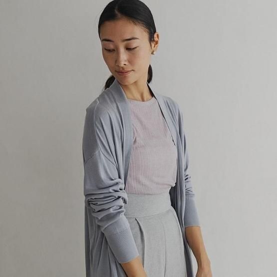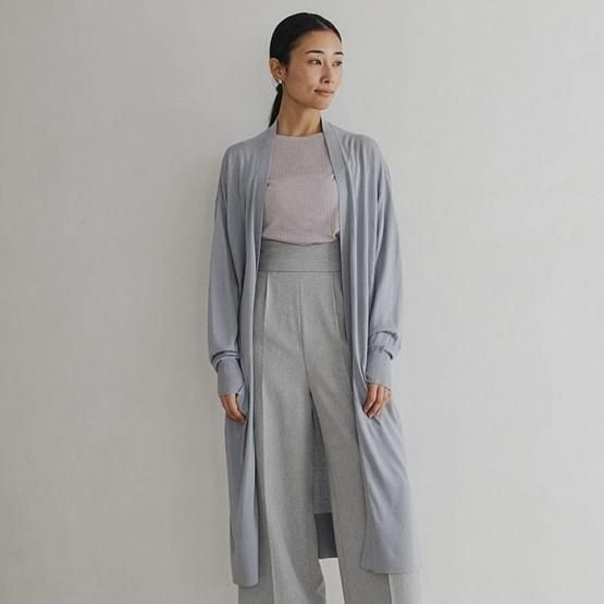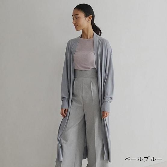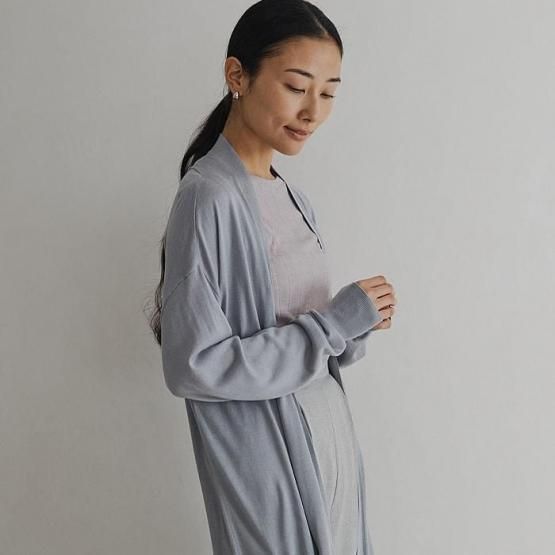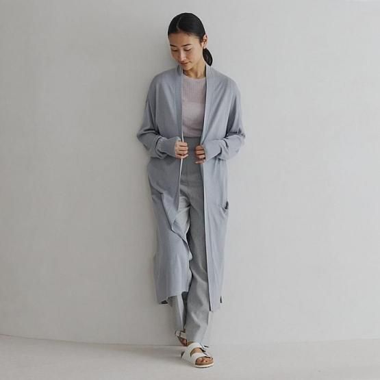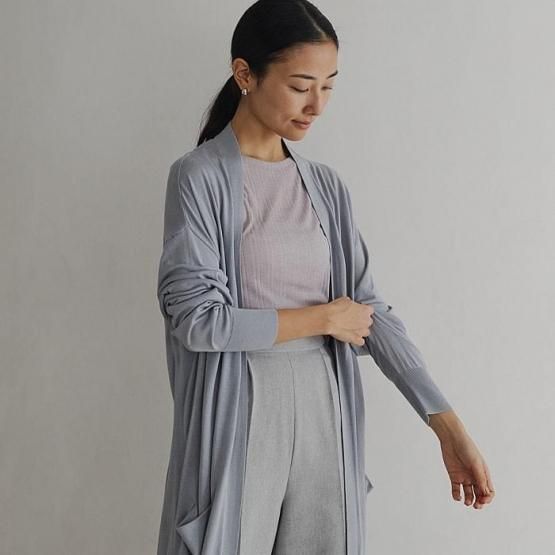 このロングカーディガンは、試着したお客様が思わずため息をもらすほどの着心地と美しいシルエットが魅力。ボタンをあえて省き、ガウンのようにさっと羽織れるデザインは、見た目にもスマートで洗練された印象に。カラーはライトグレーとチャコールグレー、そしてクリアーな発色が大人らしさ満点のペールブルーの選ぶのが楽しい3色をご用意しました。