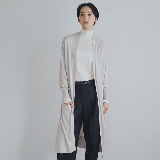 シルク100%の贅沢なロングカーディガンはキレイめな印象も簡単に作り出せます。アクセサリーや靴でドレスアップすれば、ビジネスシーンやオケージョンなどのきちんとした場所でも重宝します。