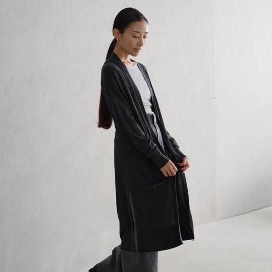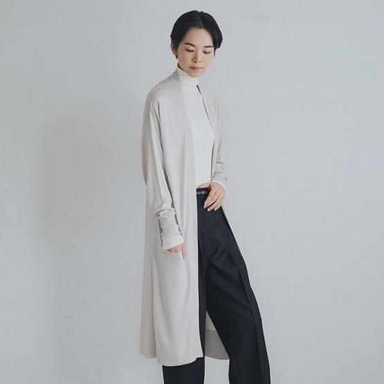一見シンプルですが、羽織った瞬間に肌にすっとなじむなめらかさと、軽さに驚くシルク100%のロングカーディガンです。