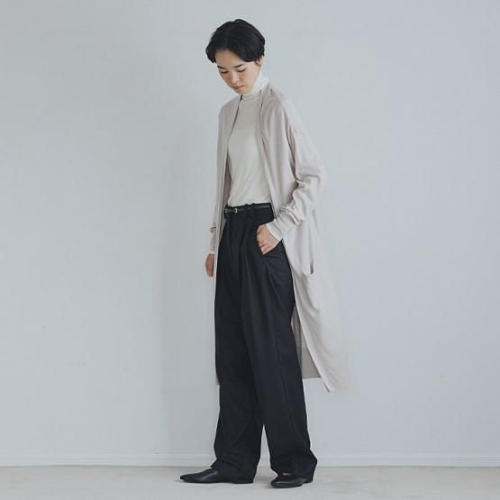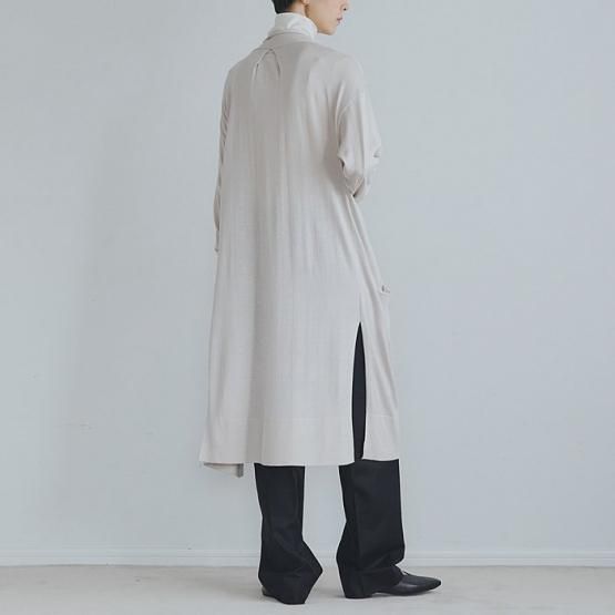 薄手で軽やかながらたっぷりの生地感は、どちらかというと「まとう」と言ったほうがしっくり来ます。歩くたびにマントのように揺れる後ろ姿と、はためくシルクの生地感が最高に優美でカッコ良い。「着られてる」感がゼロですし、ほっこり感よりもモード感を求める方に最適なアイテムだと思います。