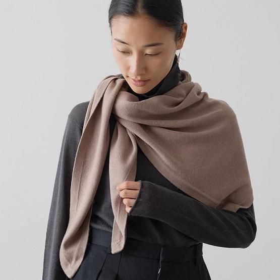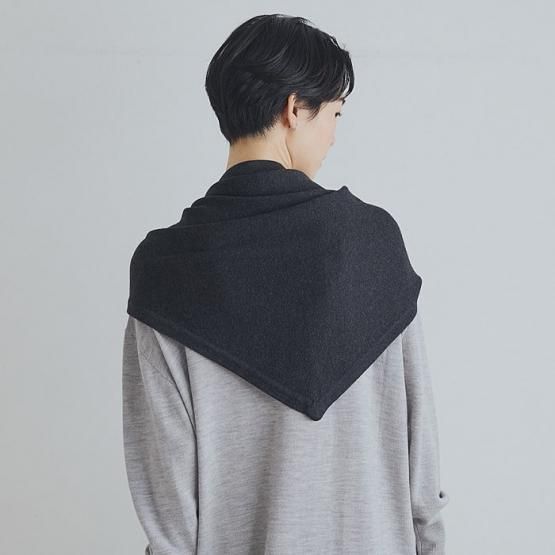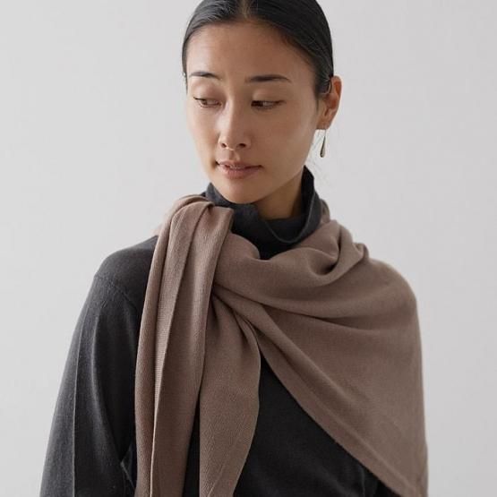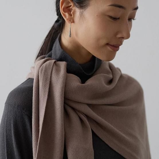 シルクカシミヤは柔らかく馴染みがいいので、巻いたときも優しく包み込まれているよう。首元から肩にしっとりと沿い、流れるドレープが華やかな印象になります。柔らかく、 大人が巻いて楽しいストールを目指しましたので、普通の形に飽きてしまった方にぜひ試していただければと思います。