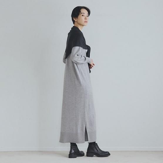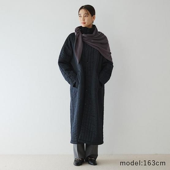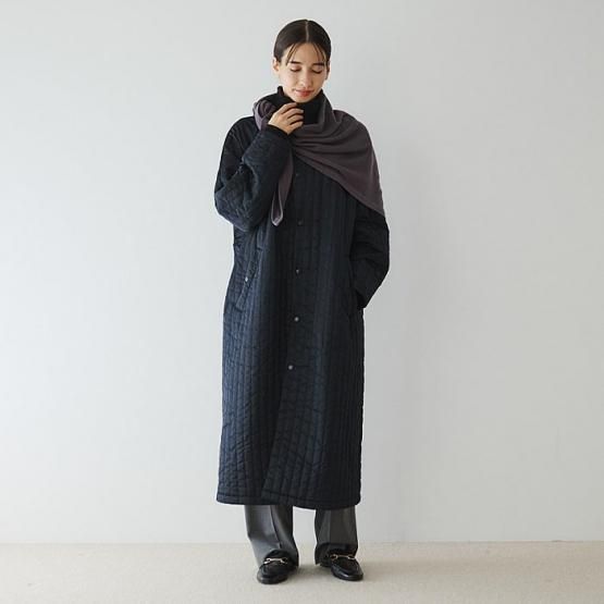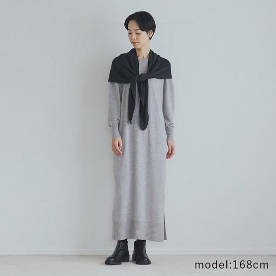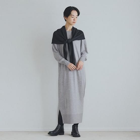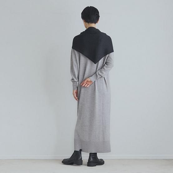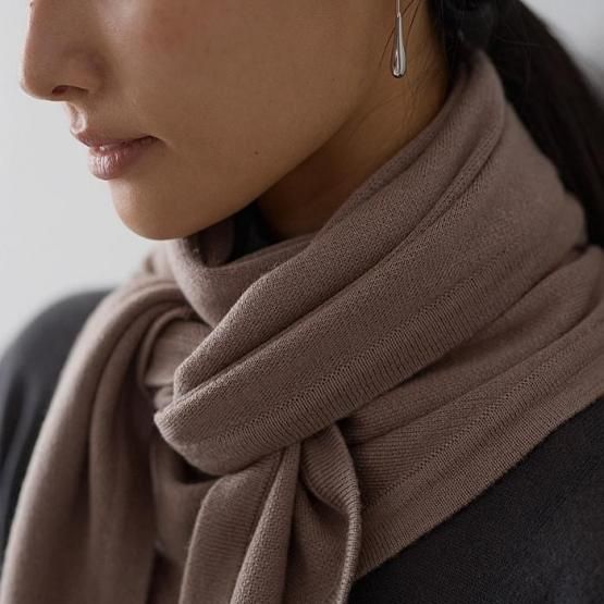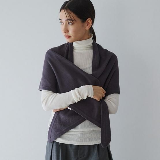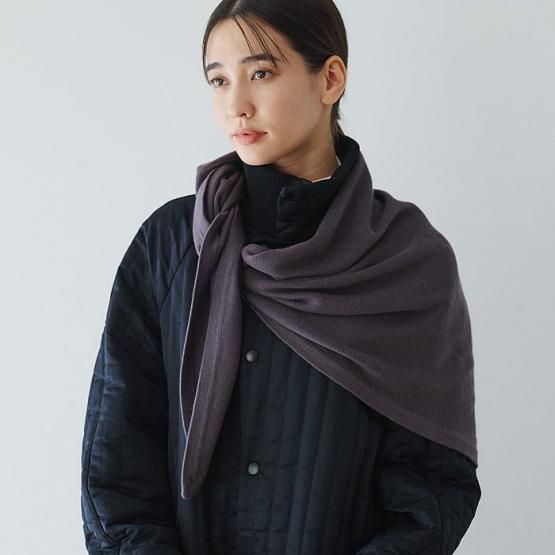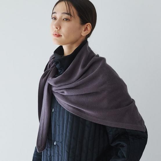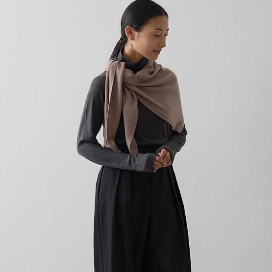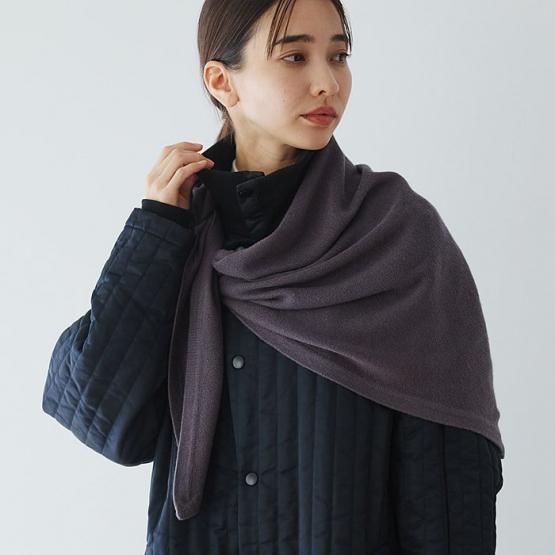 コートやジャケットなどアウターの上からはもちろんのこと、ニットやブラウスに合わせてスカーフとして、早い時期からお使いいただけます。厚すぎず薄すぎず、巻いたり結んだりアレンジしやすいちょうどよい肉感になるように、数種類の異なる編み地でサンプルを作り、生地厚にはこだわりました。