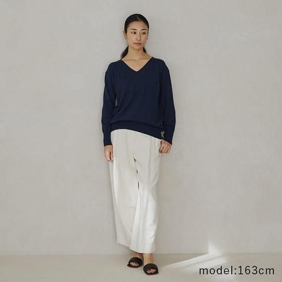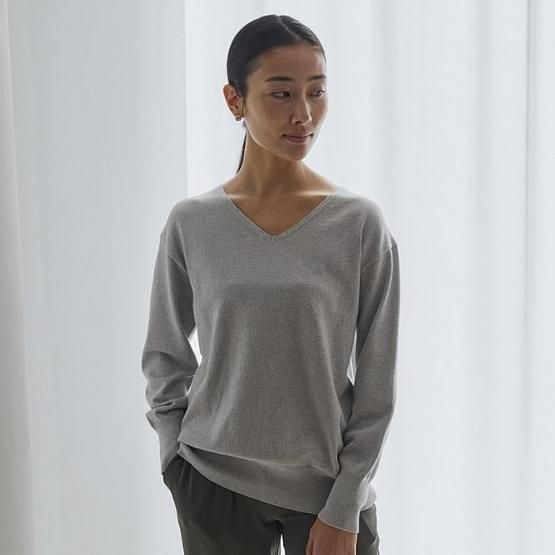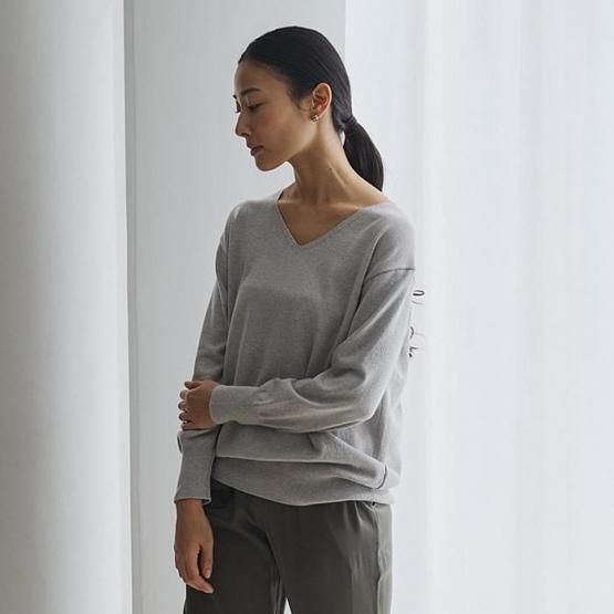 ネックラインを少し浅めに 「Vネックの胸元が開きすぎていないか心配」「何度も着ると襟が開いてくる」というお声を元に、デコルテをほどよく見せつつも、ネックラインを浅めに作りました。さらに襟や肩のラインも詰めて、かがんだ時に胸元が大きく開かないように工夫を施しています。 バストをゆったり 以前のデザインはバストが102cmだったのですが、104cmに広げました。些細なサイズ調整ですが、着ると少しゆったりとした着心地を実感していただけます。 袖丈を長く 以前のデザインは9分丈で、手首が華奢見えするように計算していたのですが、「もう少し長いと寒い季節も着られる」というお声を受けて袖丈を4cm長くしました。手首までしっかり覆うので寒い日でも着ていただけます。もちろん、袖のリブは長めの設定。手首が華奢に見えるところは変わりありません。