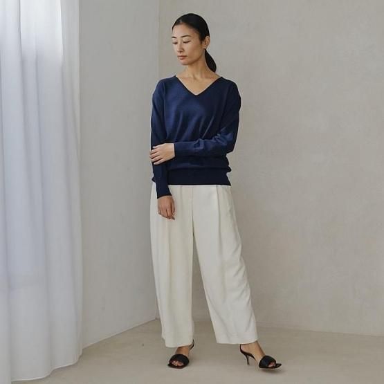 どこか気のきいた感じに見えるのはシルク50%混だから。たくさん洋服を着てきた大人の女性にもご納得いただけるよう、このニットはシルクとコットンを組み合わせて、しっかり高見えするよう作りました。