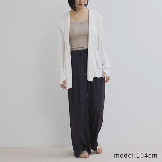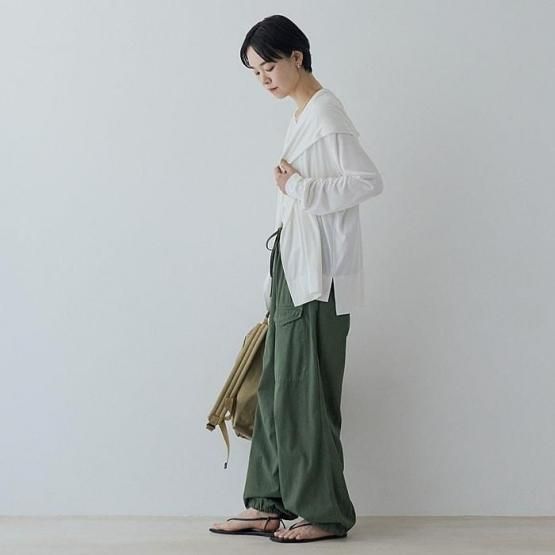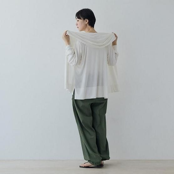 ワイドパンツと合わせると余裕のある大人のシルエットに。定番のシルクモダールパンツ、テーパードパンツと合わせれば、軽やかで少しスポーティーなルックが完成。ホームウェアやバカンスウェアとして、これ以上ないほどリラックスできる組み合わせです。締め付け感がないので長距離移動も楽しめます。