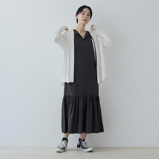 意識したのは、子供っぽくスポーティーになりすぎないこと。パーカーはどうしてもカジュアルな印象になりがちですが、女性らしさを忘れないために試行錯誤を繰り返しました。 パーカーといってもフードが目立つデザインではなく、前からだとショールカラーのように見えるので、キレイめなアイテムとも違和感なくコーディネートOKで、さまざまなシーンでお使いいただけます。
