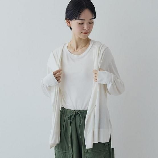 トップスでオススメなのは、同じ生地のフレンチスリーブカットソーやフレアカットソー、長袖のドルマンスリーブカットソーとのコーディネート。同じ色でアンサンブル風に着こなしても素敵ですし、あえて違う色でレイヤードを楽しむのも◎。このスタイリングのようにシルクリブタンクトップとの組み合わせも、涼しくてヘルシーです。