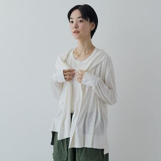 軽くて薄い生地で作ったパーカーなので、重さもなくかさばらないのも嬉しいポイント。例えば、毎日の犬の散歩の日焼け対策として、または少し肌寒い夕方の羽織り要員として。持っておくと安心ですし、バッグにクルクルっと丸めて入れても邪魔になりません。 ヨガやジムの行き帰りに、スポーティーすぎないデザインでさっと羽織れば、大人の余裕を感じるスタイルに。レストランでのクーラー対策や、旅行先の飛行機やホテル、移動中の冷え対策にもぴったり。飛行機の中で眠るときには、フードをかぶれば顔まわりを優しく包み込んでくれます。 また、品のあるデザインなので、ビジネスシーンでも活躍。オフィスでの冷房対策や、通勤電車内の冷え対策としても最適です。いろんな場面で、そっと寄り添う一枚です。