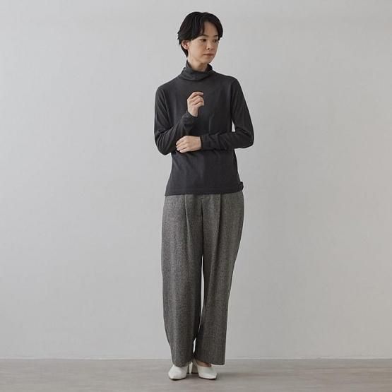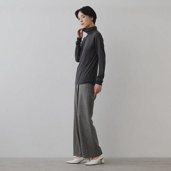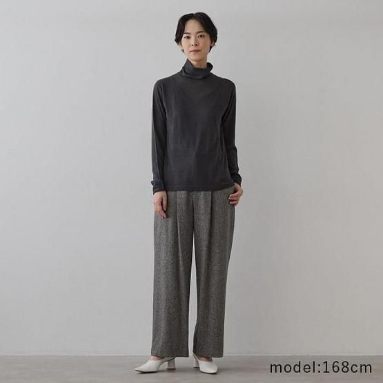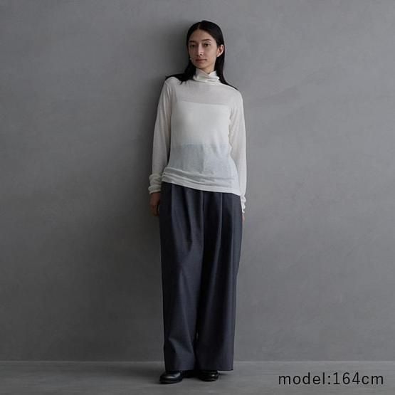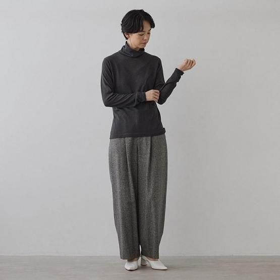 ※2 シルクカシミヤは、柔らかな風合いを生かした素材のため、カシミヤ繊維の毛羽が他の衣類に付着することがございます。特に濃淡のある色の組み合わせでは目立ちやすいため、着用前に軽くブラッシングや衣類用テープで毛羽を整えていただくと安心です。