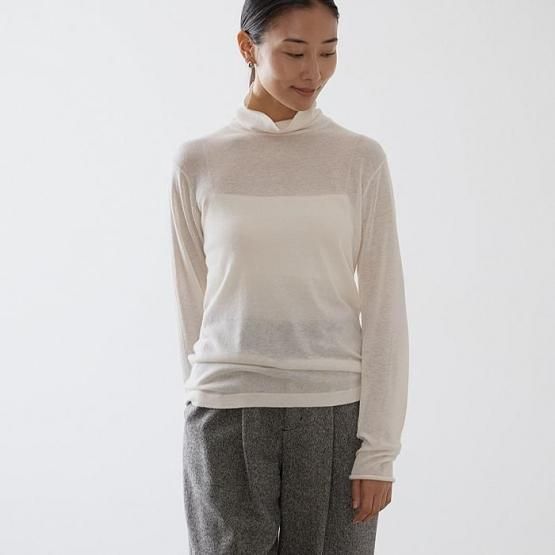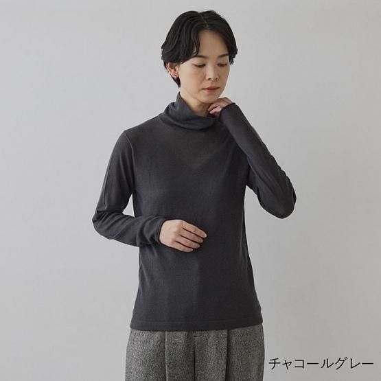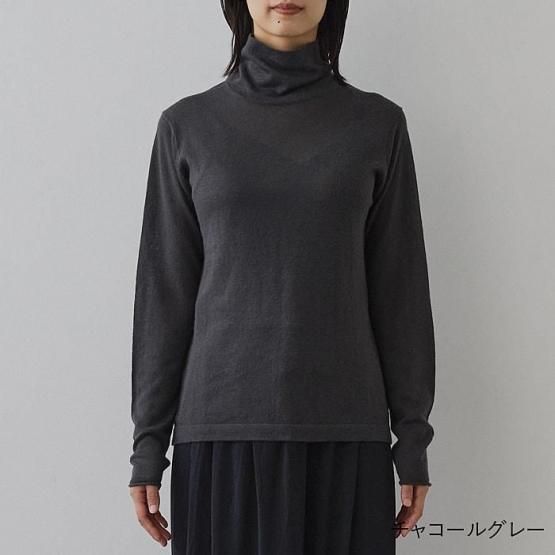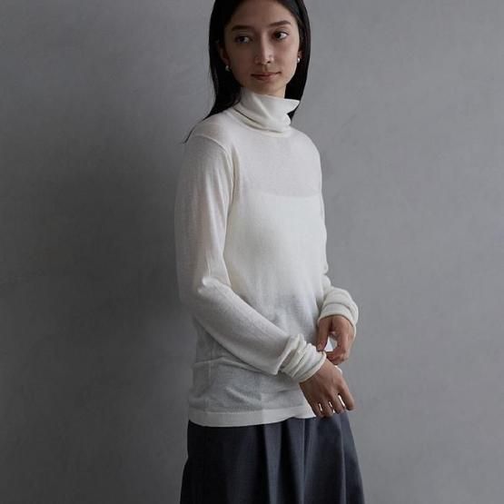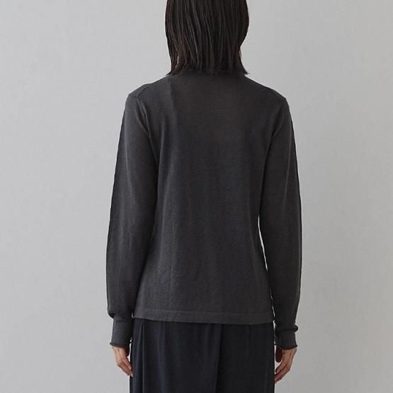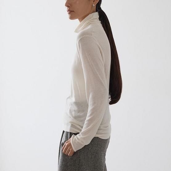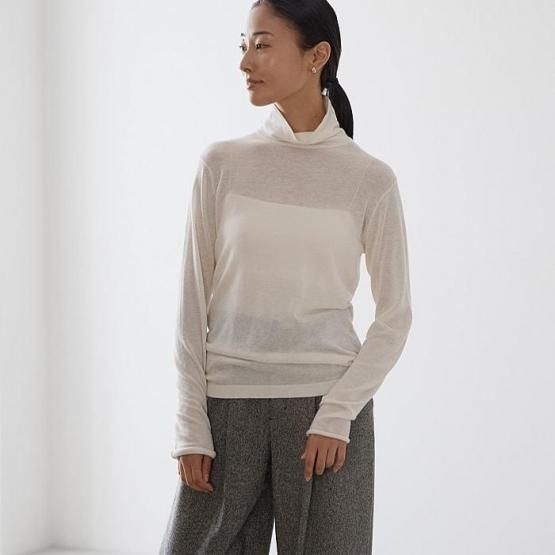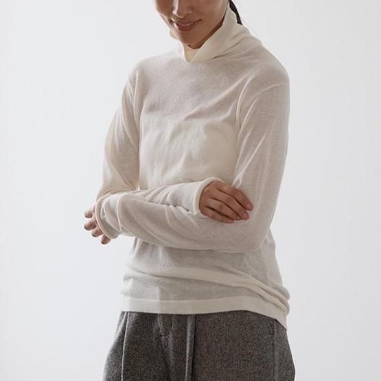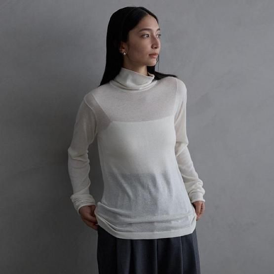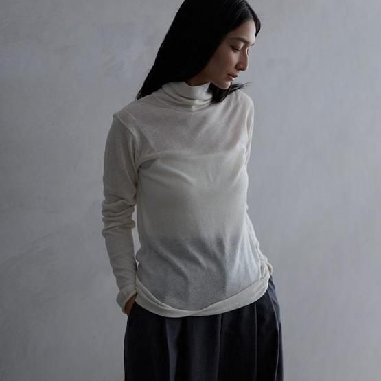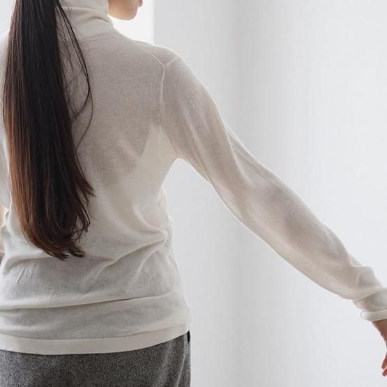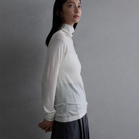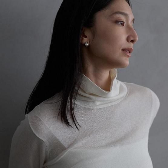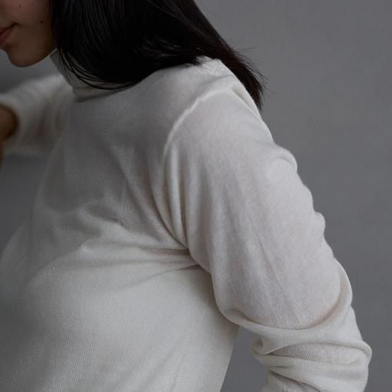 繊細なシルクをメインに、柔らかなカシミヤもたっぷり15%入っているので、驚くほど軽く、ふんわりした暖かさ。“着る”というより“心地よさを纏う”と表現したほうが適切かもしれません。薄くて軽やかな編地なので、少し残暑の残る季節にも心地よくお召しいただけます。