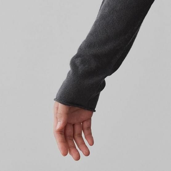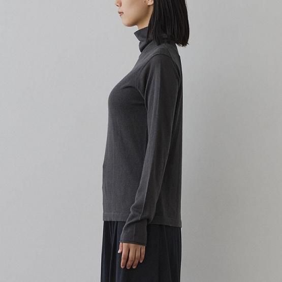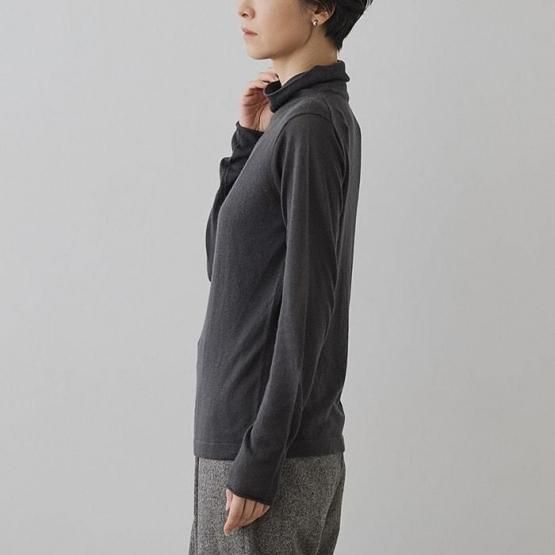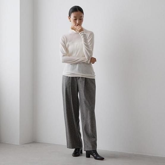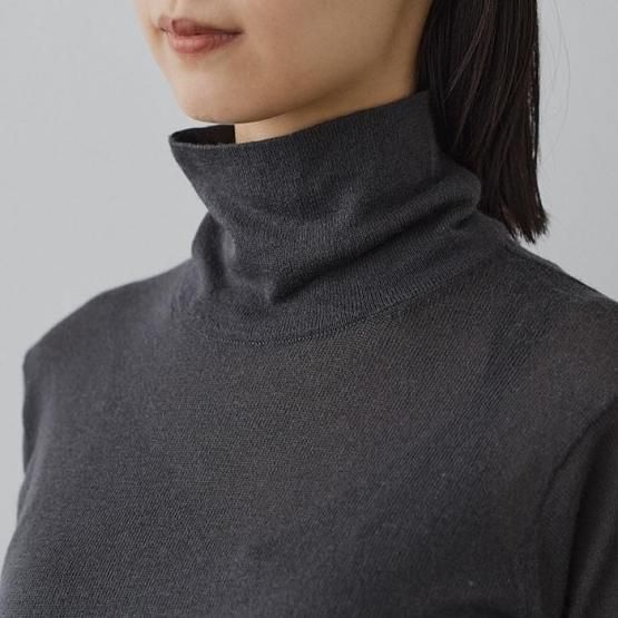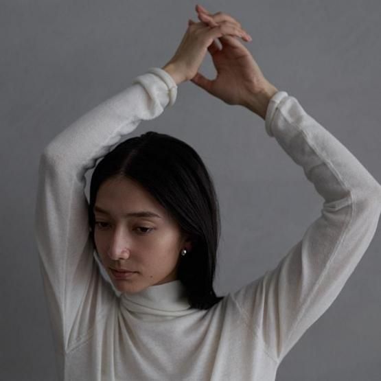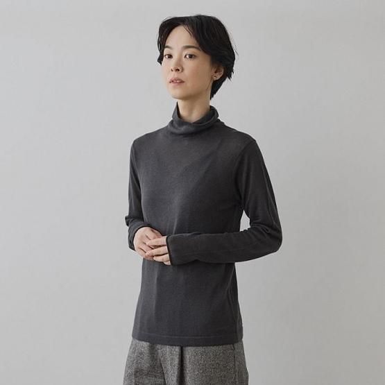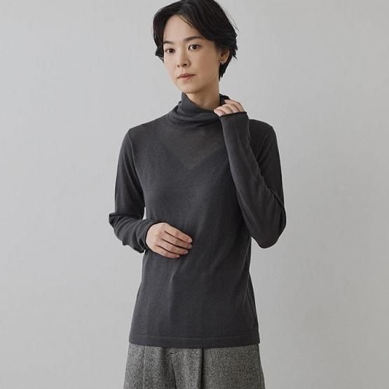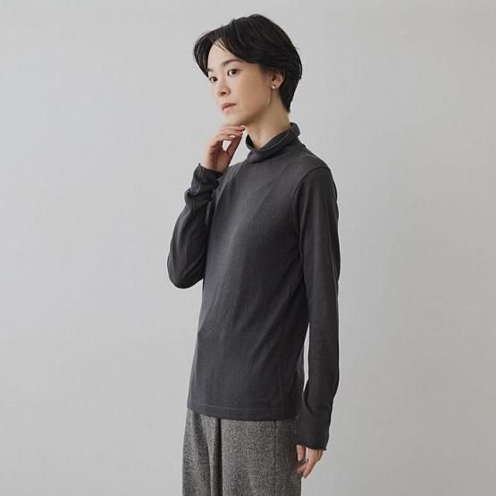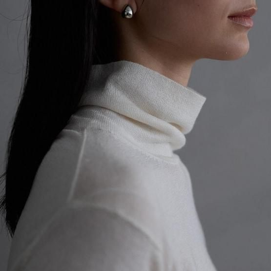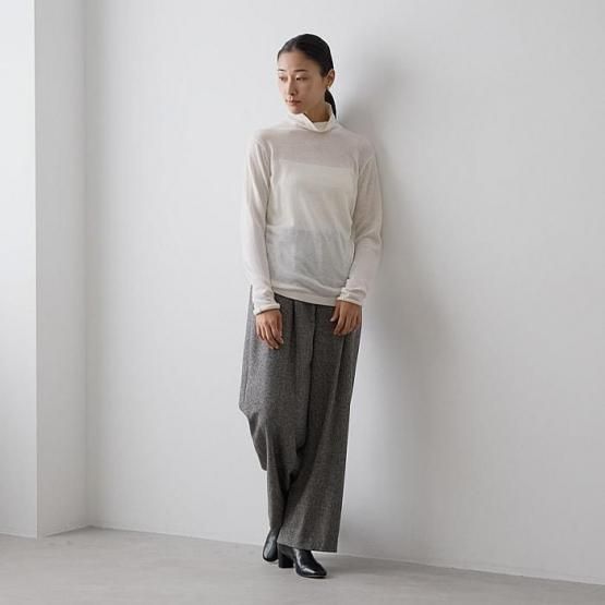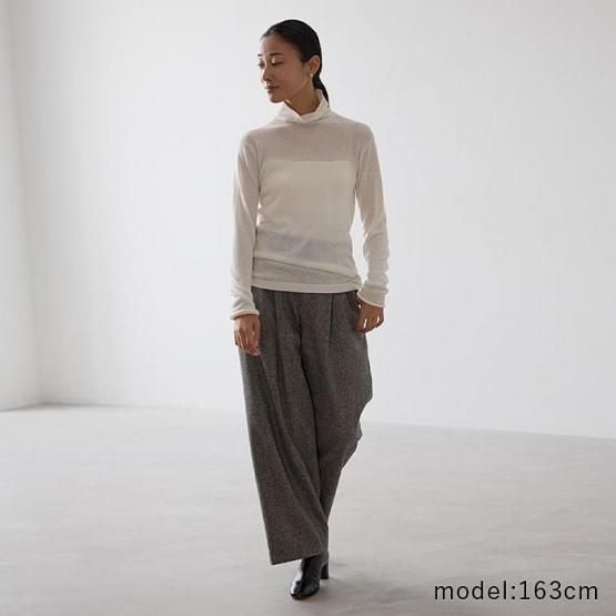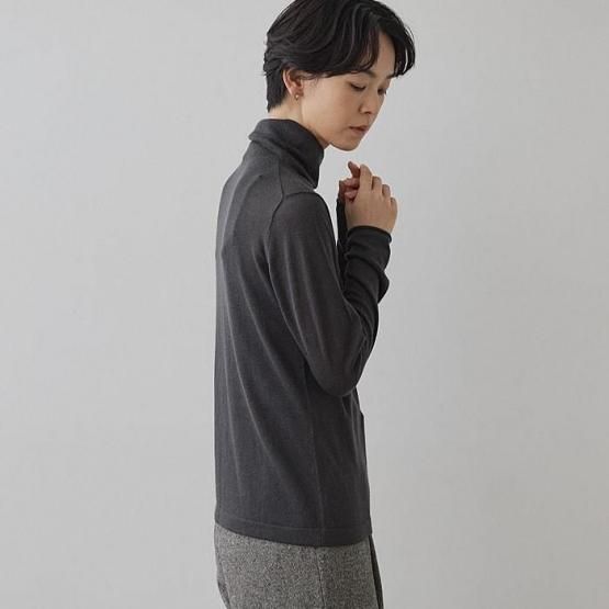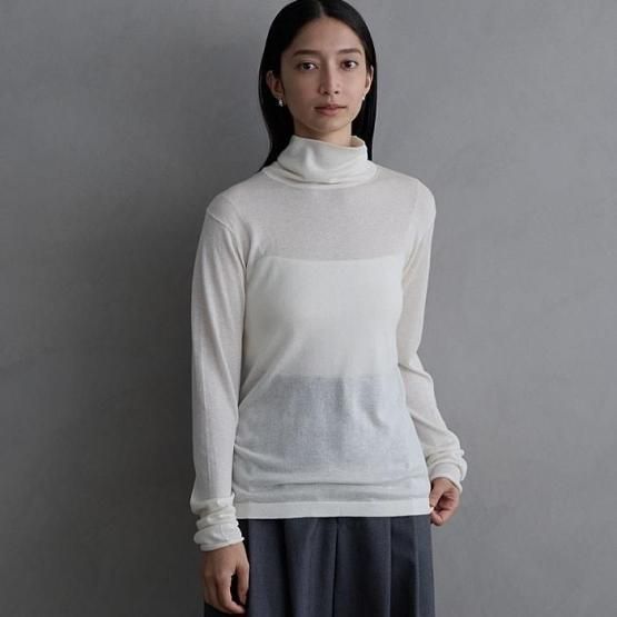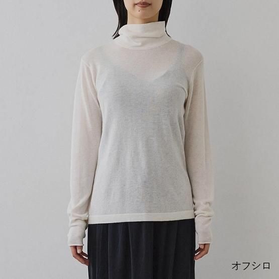 繊細なシルクをメインに、柔らかなカシミヤもたっぷり15%入っているので、驚くほど軽く、ふんわりした暖かさ。“着る”というより“心地よさを纏う”と表現したほうが適切かもしれません。薄くて軽やかな編地なので、少し残暑の残る季節にも心地よくお召しいただけます。